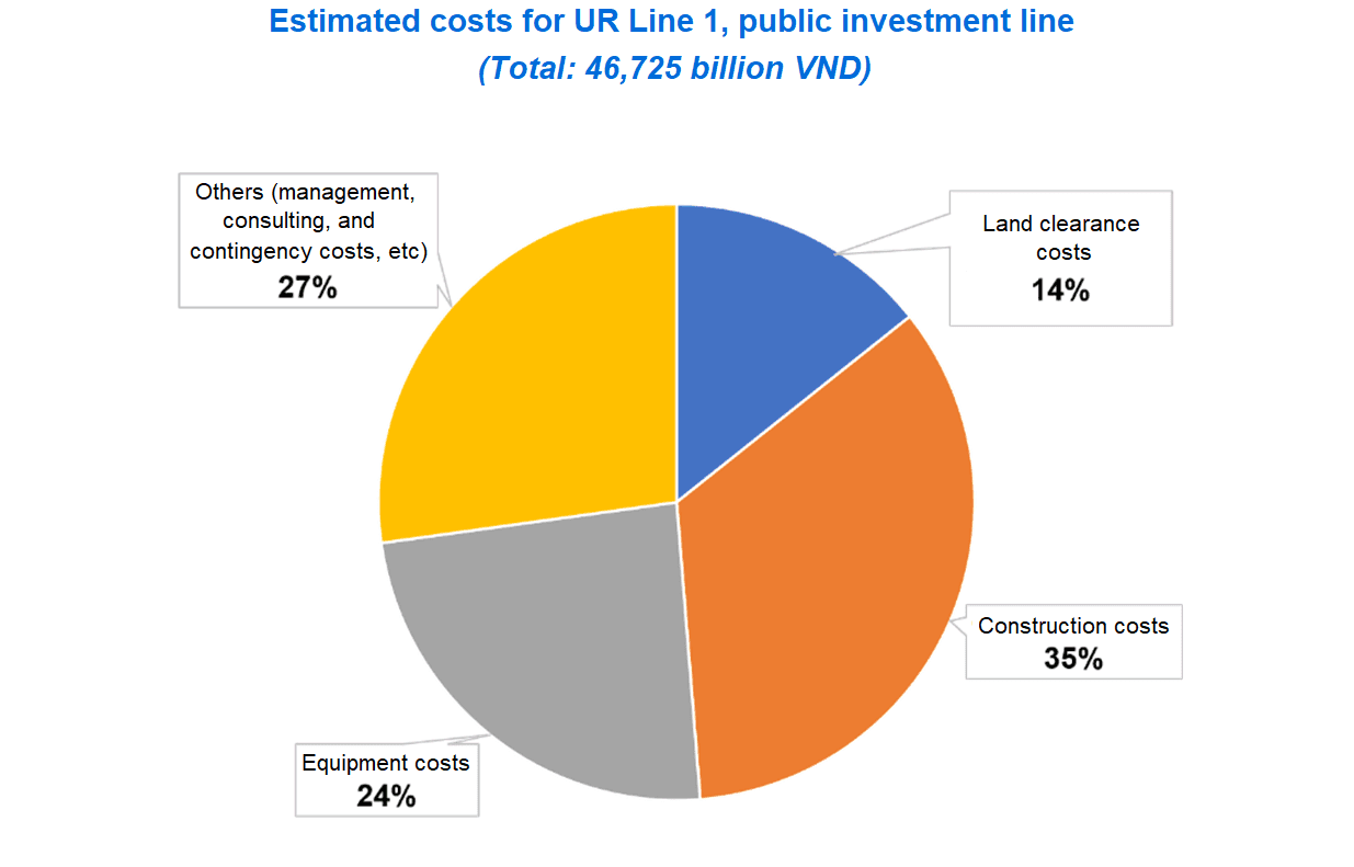 UR Line 1 has an estimated total investment of approximately 46,725 billion VND; including land clearance costs of 6,679 billion VND, construction costs of 16,092 billion VND, equipment costs of 11,252 billion VND, and the Line 1 remainder are management, consulting, and contingency costs. This line has 19 stations, along with the Suoi Tien Bus Station of Metro Line 1 (Ben Thanh – Suoi Tien).